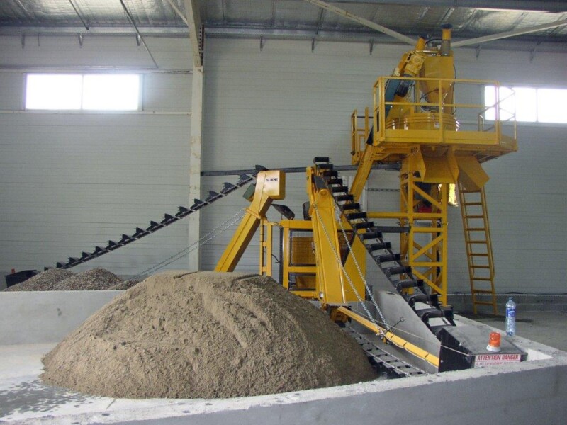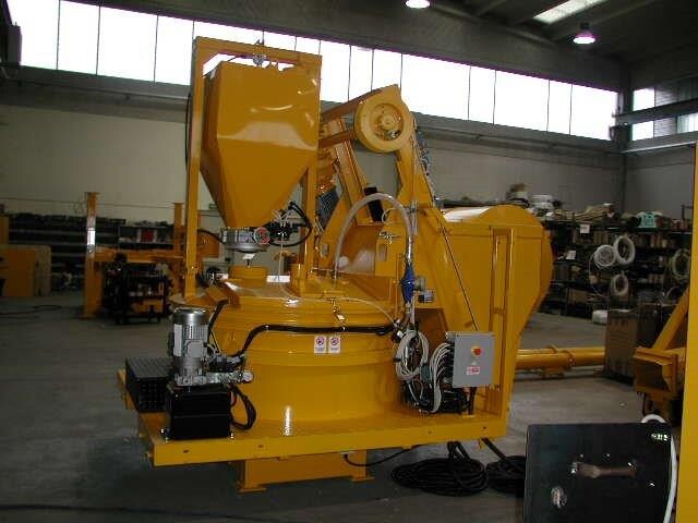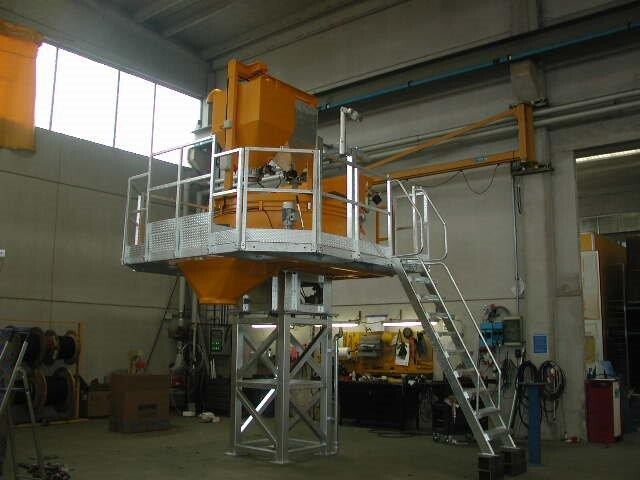 Impianto di betonaggio a raggio raschiante costituito da struttura portante ad altezza variabile, pedana di servizio, mescolatore turbo a 1 scarico con skip caricatore e dosatore, raggio raschiante e quadro di comando.